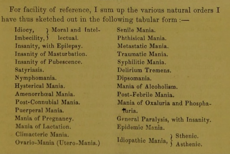 During his career, Skae’s most acclaimed contribution to the field of psychiatry was his classification of mental diseases. His major work was the ‘Classification on the Various Forms of Insanity on a Rational and Practical Basis’, which was first delivered as a lecture in 1863.[5] Within this work, Skae classified mental diseases into twenty-seven natural orders, which are outlined in the image below.